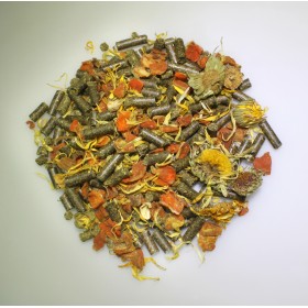 Tortoise Mix est l'aliment de base naturel parfait pour toutes les tortues. Contrairement à la plupart des aliments pour tortues, Tortoise Mix n'est pas fait de granulés extrudés avec des ingrédients douteux comme la farine de poisson, mais se compose uniquement d'ingrédients naturels, à base de plantes et végétaux. En plus des granulés de foin, qui se composent d'une variété d'herbes sauvages différentes, des carottes séchées et des fleurs de calendula sont incluses. Surtout les fleurs de calendula sont un régal savoureux pour les tortues. La nourriture est riche en vitamines naturelles et a une teneur élevée en fibres brutes, comme le recommandent les vétérinaires.
